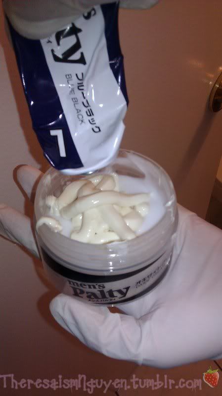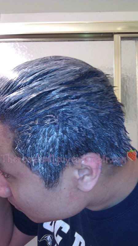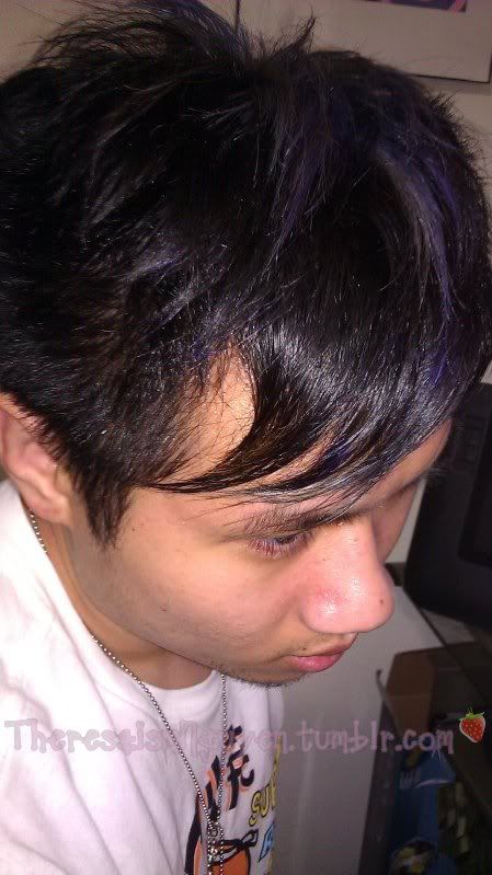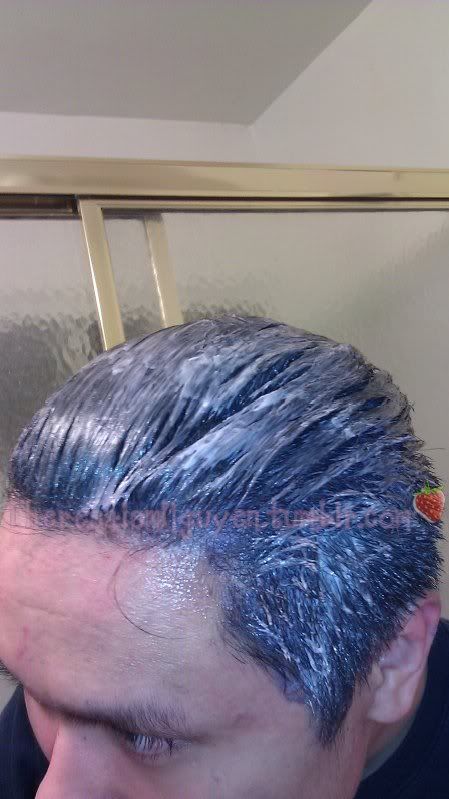 We all know that the picture on these Japanese hair colors are MISLEADING, but I decided to give it the benefit of the doubt so I chose this blue/grey looking color. (the package clearly says BLUE BLACK though) > So I tried it on a friend of mines hair. ( I usually just give him bright purple highlights, but they are faded)